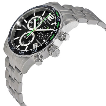 Stainless steel case with a stainless steel bracelet. Fixed stainless steel bezel with a black top ring. Black dial with luminous silver-tone hands and index hour markers. An Arabic numeral appears at the 12 o'clock position. Minute markers around the outer rim. Dial Type: Analog. Luminescent hands and markers. Date display at the 4 o'clock position. Chronograph - three sub-dials displaying: 60 second, 30 minute and 1/10th of a second. ETA caliber G10.212 AB quartz movement. Scratch resistant sapphire crystal. Solid case back. Case size: 42 mm. Case thickness: 11.2 mm. Round case shape. Deployment clasp with a push button release. Water resistant at 100 meters / 330 feet. Functions: chronograph, rattrapante, date, hour, minute, small second. Sport watch style. Watch label: Swiss Made. Certina DS Sport Chronograph Black Dial Men's Watch C027.417.11.057.01.