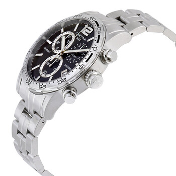 Stainless steel case with a stainless steel bracelet. Fixed stainless steel bezel. Black dial with luminous silver-tone hands and index hour markers. An Arabic numeral marks the 12 o'clock position. Minute markers around the outer rim. Dial Type: Analog. Luminescent hands and markers. Date display at the 4 o'clock position. Chronograph - three sub-dials displaying: 60 second, 30 minute and 1/10th of a second. Quartz movement. Scratch resistant sapphire crystal. Solid case back. Case diameter: 42 mm. Case thickness: 13 mm. Round case shape. Deployment clasp with push button release. Water resistant at 100 meters / 330 feet. Functions: chronograph, date, hour, minute, second. Sport watch style. Watch label: Swiss Made. Certina DS Sport Chronograph Black Dial Stainless Streel Men's Watch C027.417.11.057.00.