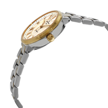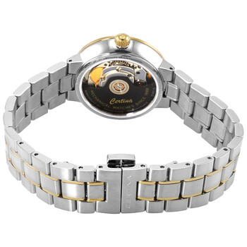 Stainless steel case with a two-tone (silver-tone and gold PVD) stainless steel bracelet. Fixed gold PVD bezel. Mother of pearl dial with gold-tone hands and Roman numeral hour markers. Minute markers around the outer rim. Dial Type: Analog. Date display at the 3 o'clock position. Powermatic 80 automatic movement with an 80-hour power reserve. Scratch resistant sapphire crystal. Pull / push crown. Round case shape. Case size: 31.6 mm. Case thickness: 9.6 mm. Fold over clasp with a push button release. Water resistant at 100 meters / 330 feet. Ds Stella Series. Casual watch style. Watch label: Swiss Made. Certina DS Stella Automatic Mother of Pearl Dial Ladies Watch C031.207.22.113.00.