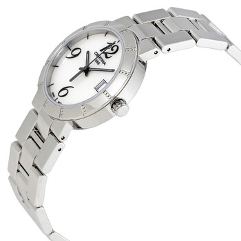 Stainless steel case with a stainless steel bracelet. Fixed stainless steel bezel. White mother of pearl dial with luminous hands and index hour markers. Arabic numerals mark the 6, 9 and 12 o'clock positions. Dial Type: Analog. Date display at the 3 o'clock position. Certina calibre ETA F06.161 quartz movement. Scratch resistant sapphire crystal. Solid case back. Case size: 31 mm. Round case shape. Band width: 20 mm. Deployment clasp with a push button release. Water resistant at 100 meters / 330 feet. Functions: date, hour, minute, second. Additional Info: suitable for snorkeling as well as swimming but not diving. Dress watch style. Watch label: Swiss Made. Certina DS Stella Stainless Steel Ladies Watch C0092101111200.