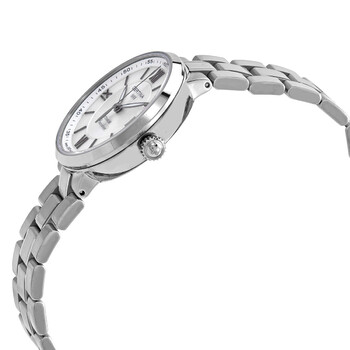 Grey titanium case with a grey titanium bracelet. Fixed grey titanium bezel. Mother of pearl (silver center) dial with luminous grey hands and index hour markers. Roman numerals appear at the 6, 9 and 12 o'clock positions. Arabic numeral minute markers (at 5 minute intervals). Minute markers around the outer rim. Dial Type: Analog. Luminescent hands. Date display at the 3 o'clock position. ETA Caliber F06.461 quartz movement. Scratch resistant sapphire crystal. Pull / push crown. Solid case back. Round case shape. Case size: 31.6 mm. Case thickness: 8,7 mm. Deployment clasp with a push button release. Water resistant at 100 meters / 330 feet. Ds Stella Series. Casual watch style. Watch label: Swiss Made. Certina DS Stella Mother of Pearl Dial Ladies Watch C031.210.44.113.00.