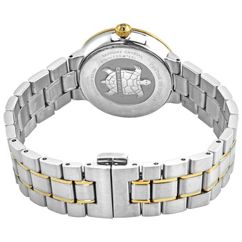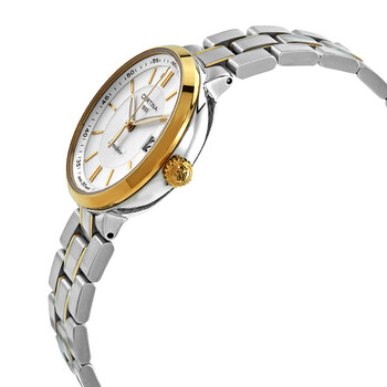Stainless steel case with a two-tone (silver-tone and gold-tone) stainless steel bracelet. Fixed gold-tone bezel. White mother of pearl (silver center) dial with luminous yellow gold-tone hands and index hour markers. Minute markers around the outer rim. Dial Type: Analog. Luminescent hands. Date display at the 3 o'clock position. ETA caliber F06.461 quartz movement. Scratch resistant sapphire crystal. Pull / push crown. Solid case back. Round case shape. Case size: 31.6 mm. Case thickness: 8.7 mm. Fold over clasp with a push button release. Water resistant at 100 meters / 330 feet. DS Stella Series. Dress watch style. Watch label: Swiss Made. Certina DS Stella Mother of Pearl Dial Two-tone Ladies Watch C0312102203100.