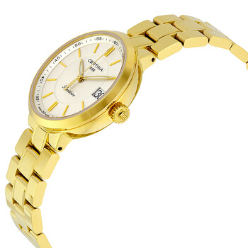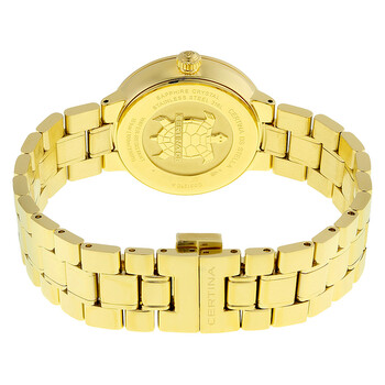Yellow gold-tone stainless steel case and bracelet. Fixed yellow gold-tone bezel. White mother of pearl (silver center) dial with luminous yellow gold-tone hands and index hour markers. Minute markers around the outer rim. Dial Type: Analog. Luminescent hands. Date display at the 3 o'clock position. ETA caliber F06.461 quartz movement. Scratch resistant sapphire crystal. Solid case back. Round case shape. Case size: 31.6 mm. Case thickness: 8.2 mm. Fold over clasp with a push button release. Water resistant at 100 meters / 330 feet. Functions: date, hour, minute, second. DS Stella Series. Casual watch style. Watch label: Swiss Made. Certina DS Stella Quartz Mother of Pearl Dial Ladies Watch C0312103303100.