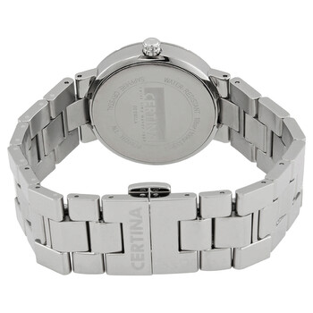 Grey titanium case with a grey titanium bracelet. Fixed grey titanium bezel. Grey dial with luminous hands and index hour markers. Arabic numerals appear at the 6, 9 and 12 o'clock positions. Dial Type: Analog. Luminescent hands. Date display at the 3 o'clock position. ETA caliber F06.161 quartz movement. Scratch resistant sapphire crystal. Solid case back. Round case shape. Case size: 31 mm. Case thickness: 8 mm. Fold over clasp with a push button release. Water resistant at 100 meters / 330 feet. Functions: date, hour, minute, second. Ds Stella Series. Dress watch style. Watch label: Swiss Made. Certina DS Stella Titanium Ladies Quartz Watch C0092104408200.