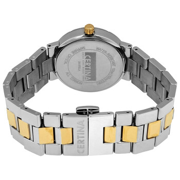 Grey titanium case with a two-tone (silver-tone and gold-tone) titanium bracelet. Fixed grey titanium bezel. White mother of pearl dial with luminous gold-tone hands and index hour markers. Arabic numerals appear atthe 6, 9 and 12 o'clock positions. Dial Type: Analog. Luminescent hands. Date display at the 3 o'clock position. ETA caliber F06.161 quartz movement. Scratch resistant sapphire crystal. Solid case back. Round case shape. Case size: 31 mm. Case thickness: 8 mm. Band width: 20 mm. Deployment clasp with a push button release. Water resistant at 100 meters / 330 feet. Functions: date, hour, minute, second. Ds Stella Series. Dress watch style. Watch label: Swiss Made. Certina DS Stella Titanium Ladies Quartz Watch C0092105511200.