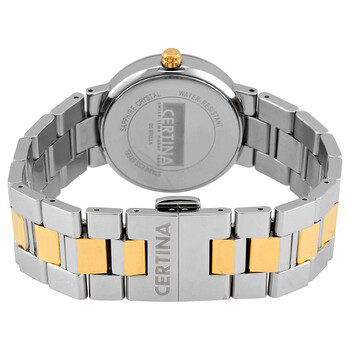 Stainless steel case with a two-tone (silver-tone and gold-tone) stainless steel bracelet. Fixed stainless steel bezel set with diamonds. White mother of pearl dial with luminous gold-tone hands and index hour markers. Diamond markers at 6, 9 and 12 o'clock positions. Dial Type: Analog. Luminescent hands. Date display at the 3 o'clock position. ETA caliber F06.161 quartz movement. Scratch resistant sapphire crystal. Pull / push crown. Solid case back. Round case shape. Case size: 31 mm. Case thickness: 8 mm. Fold over clasp with a push button release. Water resistant at 100 meters / 330 feet. Functions: date, hour, minute, second. Ds Stella Series. Dress watch style. Watch label: Swiss Made. Certina DS Stella Two-Tone Stainless Steel Ladies Watch C0092102211600.