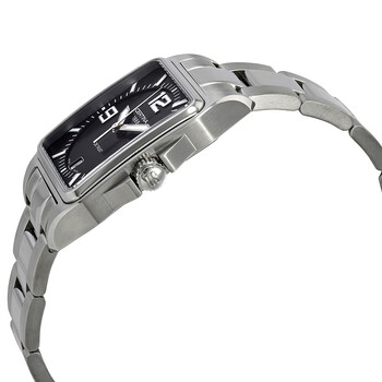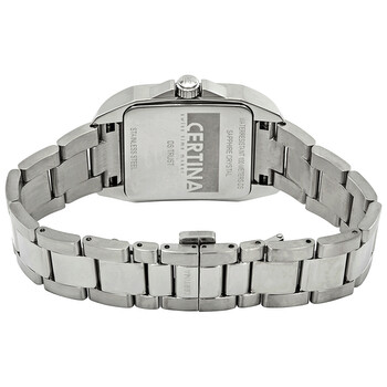 Stainless steel case with a stainless steel bracelet. Fixed stainless steel bezel. Black dial with luminous silver-tone hands and index hour markers. Arabic numerals mark the 3, 9 and 12 o'clock positions. Minute markers around the outer rim. Dial Type: Analog. Luminescent hands and markers. Date display at the 6 o'clock position. ETA caliber 955.112 quartz movement. Scratch resistant sapphire crystal. Pull / push crown. Solid case back. Rectangle case shape. Case size: 34 mm. Case thickness: 8.6 mm. Band width: 20 mm. Deployment clasp. Water resistant at 100 meters / 330 feet. Functions: date, hour, minute, second, battery eol indicator. Casual watch style. Watch label: Swiss Made. Certina DS Trust Black Dial Ladies Watch C019.510.11.057.00.