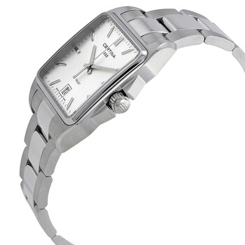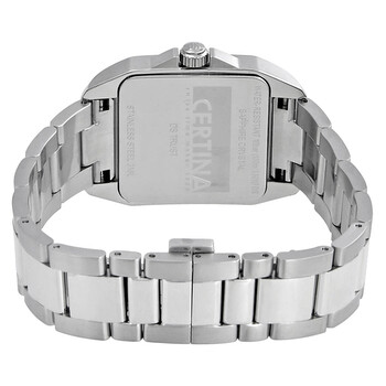 Stainless steel case with a stainless steel bracelet. Fixed stainless steel bezel. Silver dial with silver-tone hands and index hour markers. Minute markers around the outer rim. Dial Type: Analog. Date display at the 6 o'clock position. ETA caliber 955.112 quartz movement. Scratch resistant sapphire crystal. Pull / push crown. Solid case back. Square case shape. Case size: 34 mm. Deployment clasp with a push button release. Water resistant at 100 meters / 330 feet. Functions: date, hour, minute, second. Ds Trust Series. Casual watch style. Watch label: Swiss Made. Certina DS Trust Quartz Silver Dial Ladies Watch C019.510.11.031.00.