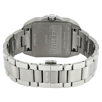 Grey titanium case with a two-tone (grey and silver-tone) titanium bracelet. Fixed grey titanium bezel. Grey dial with luminous silver-tone hands and index hour markers. Arabic numerals appear at the 3, 9 and 12 o'clock positions. Minute markers. Dial Type: Analog. Luminescent hands and markers. Date display at the 6 o'clock position. ETA caliber 955.112 quartz movement. Scratch resistant sapphire crystal. Pull / Push. Solid case back. Rectangle case shape. Case size: 34 mm. Case thickness: 8.6 mm. Fold over clasp with a push button release. Water resistant at 100 meters / 330 feet. Functions: date, hour, minute, second, battery eol indicator. DS Trust Series. Casual watch style. Watch label: Swiss Made. Certina DS Trust Titanium Watch C019.510.44.087.00.