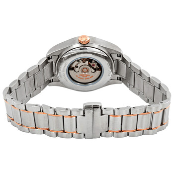 Stainless steel case with a two-tone (silver-tone and rose gold PVD) stainless steel bracelet. Fixed stainless steel bezel. Silver dial with rose gold-tone hands and index hour markers. Minute markers. Arabic numeral minute markers (at 5 minute intervals) around the outer rim. Dial Type: Analog. Date display above the 6 o'clock position. ETA caliber 2671 automatic movement with a 38-hour power reserve. Scratch resistant sapphire crystal. Pull / push crown. Transparent case back. Round case shape. Case size: 30 mm. Case thickness: 11 mm. Band width: 15 mm. Band length: 7 inches. Butterfly clasp with a push button release. Water resistant at 100 meters / 330 feet. Functions: date, hour, minute, second. Dress watch style. Watch label: Swiss Made. Certina DS-1 Lady Automatic Ladies Watch C006.207.22.031.00.