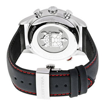 Stainless steel case with a black fabric strap. Fixed stainless steel bezel with a black top ring showing tachymeter markings. Black dial with luminous silver-tone hands and index hour markers. Arabic numeral minute markers (at 5 minute intervals). Minute markers around the outer rim. Dial Type: Analog. Luminescent hands and markers. Date display above the 6 o'clock position. Chronograph - three sub-dials displaying: 60 second, 30 minute and 12 hour. ETA caliber 251.294 PRD quartz movement. Scratch resistant sapphire crystal. Screw down crown. Solid case back. Round case shape. Case size: 43 mm. Case thickness: 14 mm. Band width: 20 mm. Deployment clasp. Water resistant at 100 meters / 330 feet. Functions: chronograph, tachymeter, date, hour, minute, second. Ds-2 Flyback Series. Luxury watch style. Watch label: Swiss Made. Item Variations: C0246181605100. Certina DS-2 Flyback Chronograph Black Dial Men's Watch C024.618.16.051.00.