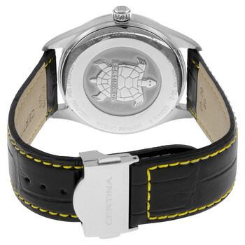 Stainless steel case with a black leather strap. Fixed stainless steel bezel. Black dial with luminous silver-tone hands and index hour markers. Minute markers around the outer rim. Dial Type: Analog. Luminescent hands. Date display at the 6 o'clock position. Quartz movement. Scratch resistant sapphire crystal. Pull / push crown. Solid case back. Case diameter: 40 mm. Round case shape. Deployment clasp. Water resistant at 100 meters / 330 feet. Functions: date, hour, minute, second. Casual watch style. Watch label: Swiss Made. Certina DS-2 Precidrive Quartz Black Dial Black Leather Men's Watch C024.410.16.051.01.