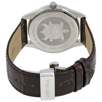 Stainless steel case with a brown leather strap. Fixed stainless steel bezel. Brown dial with luminous silver-tone hands and Arabic numeral hour markers. Minute markers around the outer rim. Dial Type: Analog. Luminescent hands and markers. Date display at the 6 o'clock position. ETA caliber E64.111 quartz movement. Scratch resistant sapphire crystal. Pull / push crown. Solid case back. Round case shape. Case size: 37 mm. Case thickness: 7.45 mm. Band width: 18 mm. Deployment clasp with a push button release. Water resistant at 100 meters / 330 feet. Functions: date, hour, minute, second. DS-4 Series. Casual watch style. Watch label: Swiss Made. Certina DS-4 Quartz Brown Dial Men's Watch C022.410.16.290.00.