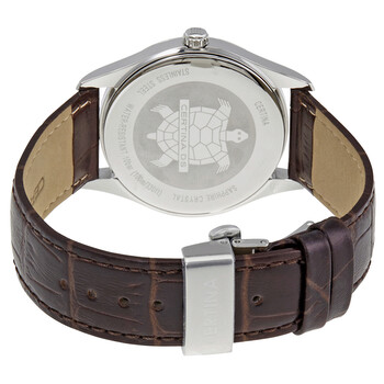Stainless steel case with a black leather strap. Fixed stainless steel bezel. Silver dial with luminous rose gold-tone hands and Arabic numeral hour markers. Dial Type: Analog. Luminescent hands and markers. Date display at the 6 o'clock position. ETA caliber E64.111 quartz movement. Scratch resistant sapphire crystal. Pull / push crown. Solid case back. Round case shape. Case size: 37 mm. Case thickness: 7.45 mm. Band width: 19 mm. Deployment clasp with a push button release. Water resistant at 100 meters / 330 feet. Functions: date, hour, minute, second. DS-4 Series. Casual watch style. Watch label: Swiss Made. Certina DS-4 Silver Dial Black Leather Watch C022.410.16.030.01.