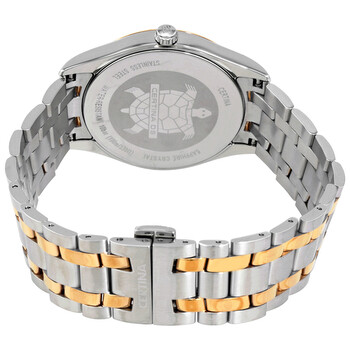 Stainless steel case with a two-tone (silver-tone and gold PVD) stainless steel bracelet. Fixed gold PVD bezel. Silver dial with luminous rose gold-tone hands and Arabic numeral hour markers. Minute markers around the outer rim. Dial Type: Analog. Luminescent hands and markers. Date display at the 6 o'clock position. ETA caliber E64.111 quartz movement. Scratch resistant sapphire crystal. Pull / push crown. Solid case back. Round case shape. Case size: 37 mm. Case thickness: 7 mm. Band width: 18 mm. Fold over clasp with a push button release. Water resistant at 100 meters / 330 feet. Functions: date, hour, minute, second. Ds-4 Series. Dress watch style. Watch label: Swiss Made. Certina DS-4 Silver Dial Two-tones Men's Watch C022.410.22.030.00.