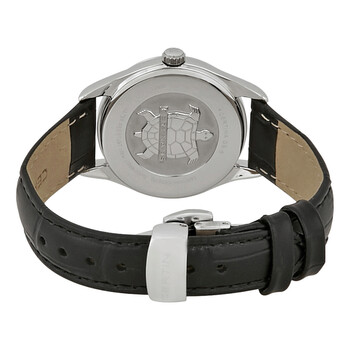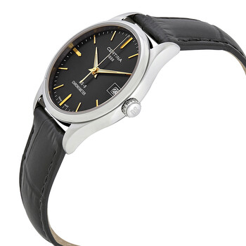 Silver-tone stainless steel case with a black leather strap. Fixed silver-tone stainless steel bezel. Anthracite dial with gold-tone hands and index hour markers. Dial Type: Analog. Date display at the 3 o'clock position. F05.411 quartz movement. Scratch resistant sapphire crystal. Case size: 30 mm. Case thickness: 6.9 mm. Round case shape. Water resistant at 100 meters / 330 feet. Functions: date, hour, minute, second. Watch label: Swiss Made. Certina DS-8 Anthracite Dial Ladies Leather Watch C033.251.16.351.01.