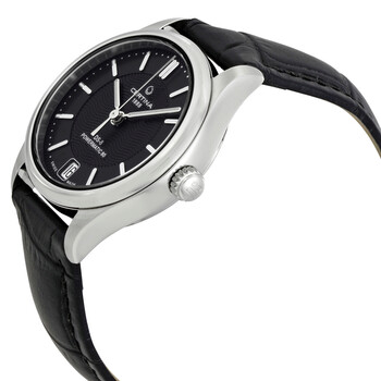 Silver-tone stainless steel case with a black leather strap. Fixed silver-tone stainless steel bezel. Black dial with luminous silver-tone hands and index hour markers. Minute markers around the outer rim. Dial Type: Analog. Luminescent hands and markers. Date display at the 6 o'clock position. Certina Calibre Powermatic 80 (ETA C07.111) Automatic movement, based upon ETA 2824-2, containing 23 Jewels, bitting at 21600 vph, and has a power reserve of approximately 80 hours. Scratch resistant sapphire crystal. Pull / push crown. Skeleton case back. Round case shape, case size: 31.50 mm, case thickness: 10 mm. Band width: 16 mm. Fold over with push button release clasp. Water resistant at 100 meters / 330 feet. Functions: date, hour, minute, second. Ds-8 Powermatic 80 Series. Dress watch style. Watch label: Swiss Made. Certina DS-8 Automatic Ladies Watch C033.207.16.051.00.