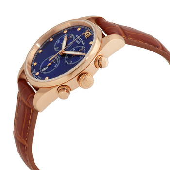 Rose gold PVD stainless steel case with a brown leather strap. Fixed rose gold PVD bezel. Blue dial with luminous rose gold-tone hands and index hour markers. A Roman numeral appears at the 12 o'clock position. Minute markers around the outer rim. Dial Type: Analog. Luminescent hands. Date display above the 6 o'clock position. Chronograph - three sub-dials displaying: 60 second, 30 minute and 1/10th of a second. Quartz movement. Scratch resistant sapphire crystal. Pull / push crown. Solid case back. Round case shape. Case size: 35 mm. Case thickness: 10.7 mm. Fold over clasp with a safety release. Water resistant at 100 meters / 330 feet. Functions: chronograph, date, hour, minute, second. Ds-8 Series. Sport watch style. Watch label: Swiss Made. Certina DS-8 Chronograph Quartz Blue Dial Ladies Watch C033.234.36.048.01.