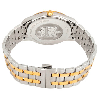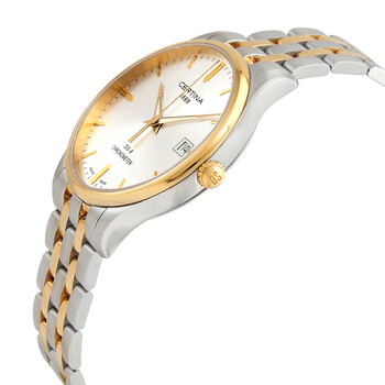 Silver-tone 316L stainless steel case with a two-tone (silver-tone and yellow gold PVD) 316L stainless steel bracelet. Silver dial with luminous yellow gold-tone hands and index hour markers. Minute markers around the outer rim. Dial Type: Analog. Luminescent hands. Date display at the 3 o'clock position. Quartz movement. Scratch resistant sapphire crystal. Pull / push crown. Solid case back. Round case shape, case size: 40.2 mm, case thickness: 8.7 mm. Band width: 20 mm. Fold over clasp with a safety release. Water resistant at 100 meters / 330 feet. Functions: date, hour, minute, second, chronometer, precidrivetm. Ds-8 Series. Dress watch style. Watch label: Swiss Made. Certina DS-8 Quartz Chronometer Silver Dial Men's Watch C0334512203100.