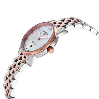 Stainless steel case with a two-tone (silver-tone and rose gold PVD) stainless steel bracelet. Fixed two-tone (silver-tone and rose gold PVD) stainless steel bezel. White mother of pearl dial with rose gold-tone hands and dot hour markers. A Roman numeral appears at the 12 o'clock position. Dial Type: Analog. Date display above the 6 o'clock position. Precidrive quartz movement. Scratch resistant sapphire crystal. Pull / push crown. Solid case back. Round case shape. Case size: 27.50 mm. Case thickness: 7.4 mm. Butterfly clasp with a push button release. Water resistant at 100 meters / 330 feet. Functions: date, hour, minute, second. Casual watch style. Watch label: Swiss Made. Certina DS-8 White Mother of Pearl Dial Ladies Watch C033.051.22.118.00.