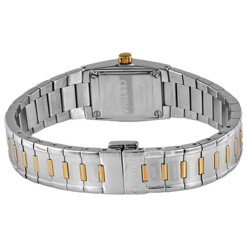 Stainless steel case with a two-toned (silver-tone and gold-tone) stainless steel bracelet. Fixed stainless steel bezel. White dial with gold-tone hands and index-Arabic numeral hour markers. Arabic numerals appear at the 6 and 12 o'clock positions. Dial Type: Analog. ETA caliber 901.001 quartz movement. Scratch resistant sapphire crystal. Pull / push crown. Rectangle case shape. Case dimensions: 19.8 mm x 21.6 mm. Fold over clasp with a push button release. Water resistant at 100 meters / 330 feet. Functions: hour, minute. Casual watch style. Watch label: Swiss Made. Certina Quartz White Dial Ladies Watch C32271574426.
