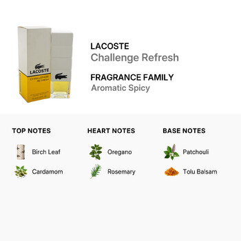 Challenge Refresh is a dynamic blend of aromatic ingredients that work together to create a clean and confident fragrance. The top notes of birch and cardamom bring a sharp, spicy edge, while hints of oregano and rosemary add a herbal twist. The base notes of patchouli and tolu balsam offer a smooth, woody finish that lingers with sophistication.
