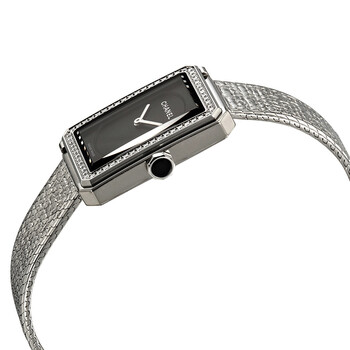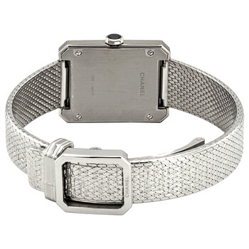Stainless steel case with a silver-tone (tweed motif) stainless steel bracelet. Fixed stainless steel set with 62 diamonds bezel. Black guilloche dial with silver-tone hands. No markers. Dial Type: Analog. Quartz movement. Scratch resistant sapphire crystal. Pull / push crown. Solid case back. Rectangle case shape, Case dimensions: 27.9 mm x 21.5 mm. Case thickness: 6.2 mm. Slip through clasp. Water resistant at 30 meters / 100 feet. Functions: hour, minute. Additional Info: bezel set with 62 brilliant-cut diamonds (~0.37 carat). Luxury watch style. Watch label: Swiss Made. Chanel Boy-Friend Black Dial Ladies Watch H4877.
