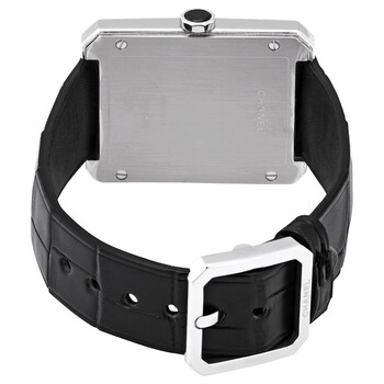 Stainless steel case with a black (alligator) leather strap. Fixed stainless steel bezel. Black guilloche dial with silver-tone hands. No markers. Dial Type: Analog. Small seconds sub-dial. Hand wind movement with a 42-hour power reserve. Scratch resistant sapphire crystal. Pull / push crown set with onyx cabochon. Solid case back. Rectangle case shape. Case dimensions: 37 mm x 28.6 mm. Case thickness: 7.7 mm. Tang clasp. Water resistant at 30 meters / 100 feet. Functions: hour, minute, second. Additional Info: crown set with onyx cabochon. Boy-friend Series. Luxury watch style. Watch label: Swiss Made. Chanel Boy-Friend Black Dial Ladies Watch H5319.