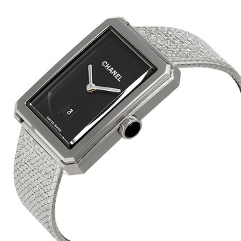 Stainless steel case with a stainless steel (tweed motif) bracelet. Fixed stainless steel bezel. Black guilloche dial with luminous silver-tone hands. No markers. Dial Type: Analog. Luminescent hands. Date display above the 6 o'clock position. Quartz movement. Scratch resistant flame fusion crystal. Pull / push crown. Solid case back. Rectangle case shape. Case dimensions: 34.6 mm x 26.7 mm. Case thickness: 7.33 mm. Tang clasp. Water resistant at 30 meters / 100 feet. Functions: date, hour, minute. Luxury watch style. Watch label: Swiss Made. Chanel Boyfriend Black Guilloche Dial Ladies Watch H4878