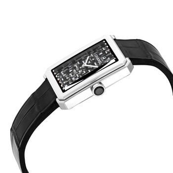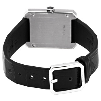 Stainless steel case with a black (alligator) leather strap. Fixed stainless steel bezel. Tweed pattern dial with silver-tone hands. No markers. Dial Type: Analog. Quartz movement. Scratch resistant sapphire crystal. Pull / push crown. Solid case back. Rectangle case shape. Case dimensions: 27.9 mm x 21.5 mm. Case thickness: 6.2 mm. Tang clasp. Water resistant at 30 meters / 100 feet. Functions: hour, minute. Boy·friend Tweed Small Series. Luxury watch style. Watch label: Swiss Made. Chanel Boy·Friend Tweed Small Quartz Ladies Watch H6127.