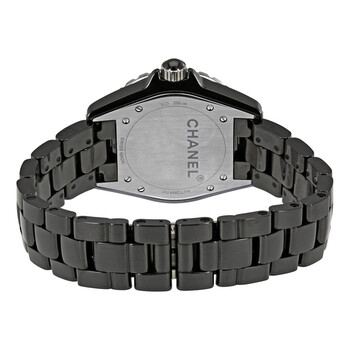 Black ceramic case with a black ceramic bracelet. Uni-directional rotating black ceramic steel rimmed bezel. Black dial with black hands and Arabic numeral hour markers. Minute markers around the outer rim. Dial Type: Analog. Luminescent hands and markers. Automatic movement with about 42 hours of power reserve. Scratch resistant sapphire crystal. Screw down crown. Solid case back. Case size: 38 mm. Round case shape. Hidden fold over clasp. Water resistant at 200 meters / 660 feet. Functions: hour, minute, second. Luxury watch style. Watch label: Swiss Made. Chanel J12 Automatic Black Dial Ceramic Unisex Watch H3829.