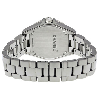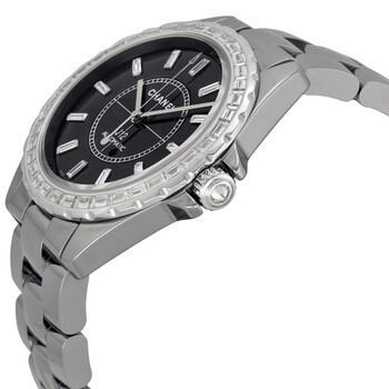 Grey titanium ceramic case with a grey titanium ceramic bracelet. Fixed 18kt white gold bezel set with 36 baguette diamonds. Black dial with rhodium-plated hands and 12 baguette-cut diamond (~0.52 carat) hour markers. Minute markers around an inner ring. Dial Type: Analog. Automatic movement with a 42-hour power reserve. Scratch resistant sapphire crystal. White gold screw down crown. Solid case back. Case size: 41 mm. Case thickness: 12 mm. Round case shape. Hidden folding clasp. Water resistant at 50 meters / 165 feet. Functions: hour, minute, second. Additional Info: bezel with 36 baguette-cut diamonds (~3.4 carats). Luxury watch style. Watch label: Swiss Made. Chanel J12 Automatic Black Dial Grey Titanium Ceramic Unisex Watch H3155.