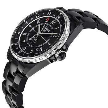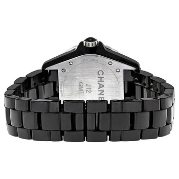 Black high-tech ceramic case with a black high-tech ceramic bracelet. Fixed black ceramic bezel with 24 hour scale. Black dial with silver-tone hands and Arabic numeral hour markers. Minute markers around an inner ring. Dial Type: Analog. Luminescent hands and markers. Date display appears between the 4 and 5 o'clock positions. Automatic movement with 42 hour power reserve. Scratch resistant sapphire crystal. Solid case back. Case diameter: 38 mm. Round case shape. Deployment with push button clasp. Water resistant at 100 meters / 330 feet. Functions: date, GMT, second time zone, hour, minute, second. Luxury watch style. Watch label: Swiss Made. Chanel J12 Automatic GMT Black High-Tech Ceramic Unisex Watch H3102.