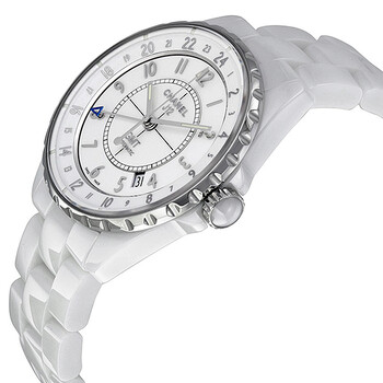White high-tech ceramic case and bracelet. Fixed bezel with 24 hour scale. White dial with silver-tone hands and Arabic numeral hour markers. 24 hour markers. Minute markers around an inner ring. Dial Type: Analog. Luminescent hands and markers. Date display appears between the 4 and 5 o'clock positions. Automatic movement with 42 hour power reserve. Scratch resistant sapphire crystal. Screw down crown. Solid case back. Case diameter: 38 mm. Round case shape. Deployment clasp with push button release. Water resistant at 100 meters / 330 feet. Functions: date, GMT, second time zone, hour, minute, second. Luxury watch style. Watch label: Swiss Made. Chanel J12 Automatic GMT White High-Tech Ceramic Ladies Watch H3103.