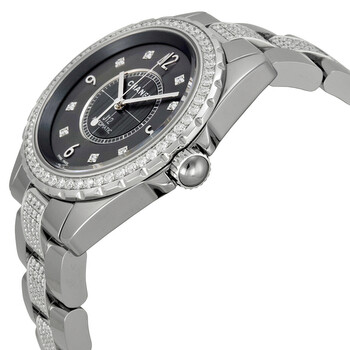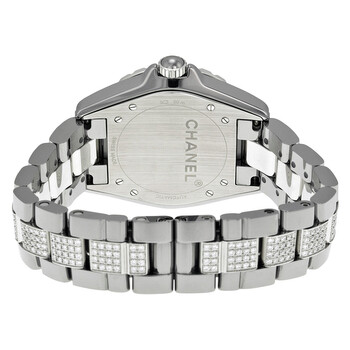 Titanium and grey ceramic case with a titanium and grey ceramic bracelet set with diamond. Fixed steel bezel set with white diamond. Grey dial with silver-tone hands and 8 diamonds hour markers. Arabic numerals mark the quarter hour positions. Minute markers around the inner ring. Dial Type: Analog. Automatic movement. Scratch resistant sapphire crystal. Solid case back. Case diameter: 38 mm. Case thickness: 11.3 mm. Round case shape. Hidden folding clasp. Water resistant at 50 meters / 165 feet. Functions: hour, minute, second. Luxury watch style. Watch label: Swiss Made. Chanel J12 Automatic Grey Dial Titanium and Ceramic Ladies Watch H3106.