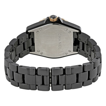 Black ceramic case with a black ceramic bracelet. Fixed 18kt rose gold bezel. Black guilloche dial with rose gold-tone hands and Arabic numeral hour markers. Minute markers around the outer rim. Dial Type: Analog. Date display at the 6 o'clock position. Small seconds sub-dial. Automatic movement with a 42-hour power reserve. Scratch resistant sapphire crystal. Screw down crown. Solid case back. Round case shape. Case size: 36.5 mm. Band width: 19 mm. Hidden fold over clasp. Water resistant at 100 meters / 330 feet. Functions: date, hour, minute, second. J12 Series. Luxury watch style. Watch label: Swiss Made. Chanel J12 Automatic Ladies Watch H3838.