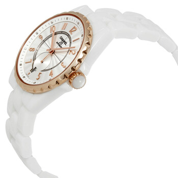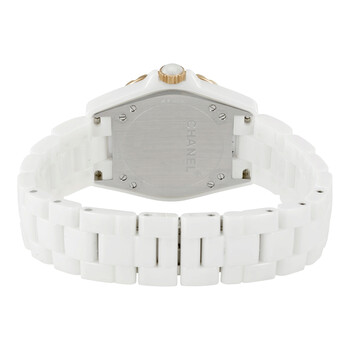 White ceramic case with a white ceramic bracelet. Fixed 18kt beige gold bezel. White dial with rose gold-tone hands and Arabic numeral hour markers. Minute markers around the outer rim. Dial Type: Analog. Date display at the 6 o'clock position. Small seconds sub-dial. Automatic movement with a 42-hour power reserve. Scratch resistant sapphire crystal. Pull / push crown. Solid case back. Round case shape. Case size: 36.5 mm. Case thickness: 11 mm. Band width: 18 mm. Hidden fold over clasp. Water resistant at 100 meters / 330 feet. Functions: date, hour, minute, second. Dress watch style. Watch label: Swiss Made. Chanel J12 Automatic White Dial Ceramic Unisex Watch H3839.