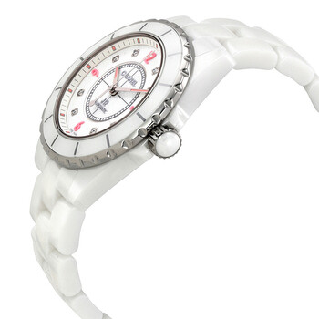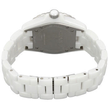 White ceramic case with a white ceramic bracelet. Uni-directional rotating stainless steel bezel with a white ceramic top ring. White lacquered dial with luminous silver-tone hands and diamond hour markers. Arabic numerals mark the 3, 6, 9 and 12 o'clock positions. Minute markers around the outer rim. Dial Type: Analog. Luminescent hands and markers. Automatic movement with a 42-hour power reserve. Scratch resistant sapphire crystal. Screw down crown. Solid case back. Round case shape. Case size: 38 mm. Case thickness: 11 mm. Band width: 22 mm. Fold over clasp. Water resistant at 200 meters / 660 feet. Functions: hour, minute, second. Additional Info: limited edition of 1200 pieces. Luxury watch style. Watch label: Swiss Made. Chanel J12 Automatic White Dial Ladies Watch H4864.