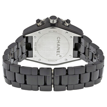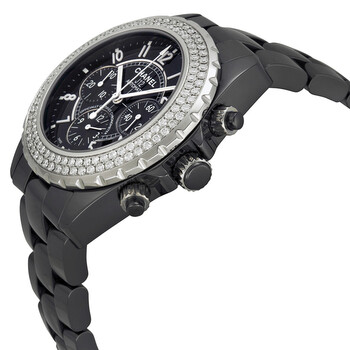 Black ceramic case with a black ceramic bracelet. Unidirectional silver-tone bezel set with 120 diamonds. Black dial with luminous hands and Arabic numeral hour markers. Minute markers around the outer rim. Dial Type: Analog. Luminescent hands and markers. Date display appears between the 4 and 5 o'clock position. Chronograph - three sub-dials displaying: 60 second, 30 minute and 12 hour. Self winding automatic movement with a 21 hour power reserve. Scratch resistant sapphire crystal. Screw down crown. Solid case back. Case diameter: 41 mm. Case thickness: 14 mm. Round case shape. Band width: 20 mm. Band length: 8 inches. Deployment clasp. Water resistant at 200 meters/ 660 feet. Functions: hours, minutes, seconds, calendar, chronograph. Sport watch style. Watch label: Swiss Made. Chanel J12 Black Ceramic Ladies Watch H1009.