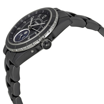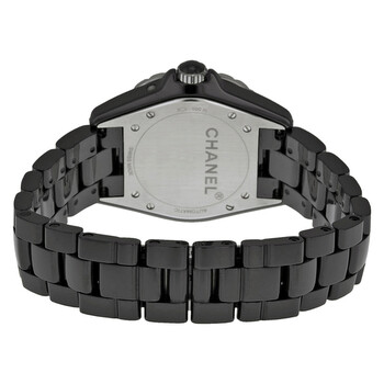 Black ceramic case with a black ceramic bracelet. Fixed stainless steel with black ceramic bezel. Black satin dial with silver-tone hands and Arabic numeral hour markers. Minute markers around an inner ring. Date scale around an outer ring. Dial Type: Analog. Date display around the inner bezel. Moonphase dial at 6 'clock. Automatic movement with a 42-hour power reserve. Scratch resistant sapphire crystal. Screw down crown. Solid case back. Case size: 38 mm. Round case shape. Deployment with push button release clasp. Water resistant at 50 meters / 165 feet. Functions: day, hour, minute, second, moonphase. Luxury watch style. Watch label: Swiss Made. Chanel J12 Black Ceramic Moonphase Unisex Watch H3406.