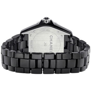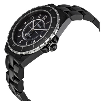 Black ceramic case with a black ceramic bracelet. Uni-directional rotating black ceramic bezel. Black dial with silver-tone hands and Arabic hour markers. Minute markers around the inner ring. Dial Type: Analog. Date display between 4 and 5 o'clock position. Automatic movement. Scratch resistant sapphire crystal. Screw down crown. Solid case back. Case diameter: 42 mm. Case thickness: 11 mm. Round case shape. Hidden folding clasp. Water resistant at 200 meters / 660 feet. Functions: hours, minutes, seconds, date. Luxury watch style. Watch label: Swiss Made. Chanel J12 Black Dial Ceramic Automatic Unisex Watch H2980.