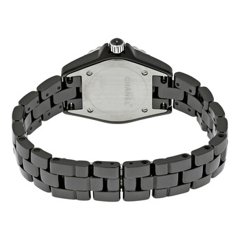 Black high-tech ceramic case and bracelet. Fixed stainless steel bezel with a black ceramic top ring. Black dial with luminous black hands and Arabic numeral hour markers. Minute markers around the outer rim. Dial Type: Analog. Luminescent hands and markers. Quartz movement. Scratch resistant mineral crystal. Screw down crown. Solid case back. Case size: 29 mm. Case thickness: 11 mm. Round case shape. Hidden fold over clasp. Water resistant at 50 meters / 165 feet. Functions: hour, minute, second. Luxury watch style. Watch label: Swiss Made. Chanel J12 Black Dial Ladies Watch H4196.