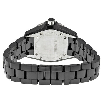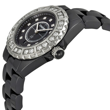 Black ceramic case with a black ceramic bracelet. Unidirectional silver-tone bezel set with 24 diamonds. Black dial with luminous hands and diamond hour markers. Minute markers around the outer rim. Dial Type: Analog. Luminescent hands. Date display at the 6 o'clock position. Quartz movement. Scratch resistant sapphire crystal. Screw down crown. Solid case back. Case diameter: 33 mm. Case thickness: 11 mm. Round case shape. Hidden folding clasp. Water resistant at 200 meters/ 660 feet. Functions: hours, minutes, seconds, calendar. Fashion watch style. Watch label: Swiss Made. Chanel J12 Black Diamond Dial Quartz Ladies Watch H2427.