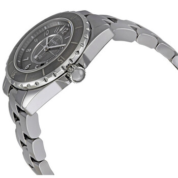 Titanium ceramic case with a titanium ceramic bracelet. Unidiectional titanium ceramic bezel. Grey dial with luminous hands and Arabic numeral hour markers. Minute markers around the outer rim. Dial Type: Analog. Date display appears between the 4 and 5 o'clock positions. Quartz movement. Scratch resistant sapphire crystal. Screw down crown. Solid case back. Case diameter: 33 mm. Case thickness: 11 mm. Round case shape. Band width: 20 mm. Triple folding clasp. Water resistant at 200 meters/ 660 feet. Functions: hours, minutes, seconds, calendar. Dress watch style. Watch label: Swiss Made. Chanel J12 Chromatic Titanium Ceramic Small Quartz Watch H2978.