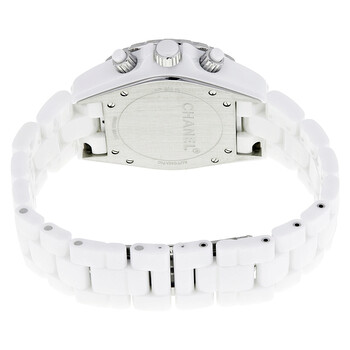 White ceramic case with a white ceramic bracelet. Uni-directional rotating steel rimmed white ceramic bezel. White dial with luminous hands and Arabic numeral hour markers. Minute markers around the outer rim. Dial Type: Analog. Luminescent hands and hour markers. Date display between the 4 and 5 o'clock positions. Chronograph - three sub-dials displaying: 60 second, 30 minute and 12 hour. Swiss automatic chronograph movement with a 42-hour power reserve. Scratch resistant sapphire crystal. Screw down crown. Solid case back. Case diameter: 41mm. Case thickness: 14 mm. Round case shape. Band length: 7 inches. Hidden deployment clasp. Water resistant at 200 meters / 660 feet. Functions: chronograph/ date/ hours/ minutes/ seconds. Sport watch style. Watch label: Swiss made. Chanel J12 Chronograph White Ceramic Unisex Watch H1007.