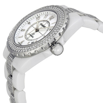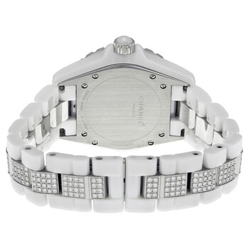 White ceramic case with a white ceramic set with diamonds bracelet. Fixed silver-tone 2 rows od white diamond bezel. White dial with luminous hands and Arabic numeral hour markers. Minute markers around the outer rim. Dial Type: Analog. Luminescent hands. Date display between 4 and 5 o'clock position. ETA Caliber 2892-A2 Automatic movement, based upon ETA 2890, containing 21 Jewels, bitting at 28800 vph, and has a power reserve of approximately 42 hours. Scratch resistant sapphire crystal. Solid case back. Round case shape, case size: 38 mm, case thickness: 11 mm. Hidden fold over clasp. Water resistant at 200 meters / 660 feet. Functions: date, hour, minute, second. Dress watch style. Watch label: Swiss Made. Chanel J12 Diamonds and Ceramic Automatic Unisex Watch H1422.