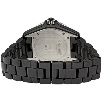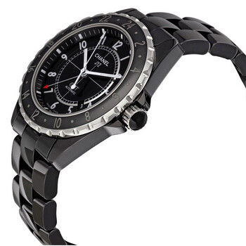 Black ceramic case with a black ceramic bracelet. Unidirectional rotating stainless steel bezel with black ceramic top ring. Black dial with luminous hands and Arabic numeral hour markers. Minute markers around the outer rim. Dial Type: Analog. Luminescent hands and hour markers. Date display between the 4 and 5 o'clock positions. Automatic movement. Scratch resistant sapphire crystal. Screw down crown with black ceramic cabochon. Solid case back. Case diameter: 42 mm. Case thickness: 10 mm. Round case shape. Band length: 7 inches. Deployment clasp. Water resistant at 100 meters / 330 feet. Functions: hours, minutes, seconds, date. Additional Info: date displays between 4 and 5 o'clock positions. Sport watch style. Watch label: Swiss Made. Chanel J12 GMT Uniusex Watch H2012.