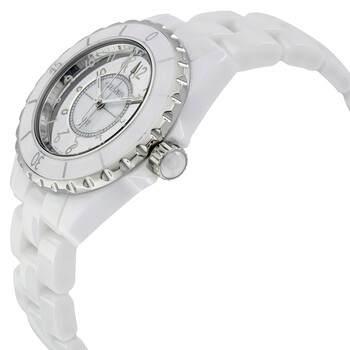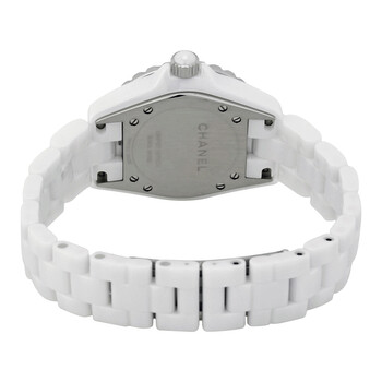 White high-tech ceramic case and bracelet. Uni-directional rotating stainless steel bezel with a white ceramic top ring. Silver dial with luminous white hands and Arabic numeral hour markers. Minute markers around the outer rim. Dial Type: Analog. Luminescent hands and markers. Quartz movement. Scratch resistant sapphire crystal. Screw down crown. Solid case back. Case size: 33 mm. Case thickness: 11 mm. Round case shape. Hidden fold over clasp. Water resistant at 200 meters / 660 feet. Functions: hour, minute, second. Additional Info: limited edition of 1200 pieces. Luxury watch style. Watch label: Swiss Made. Chanel J12 Ladies Watch H4861.