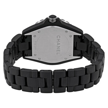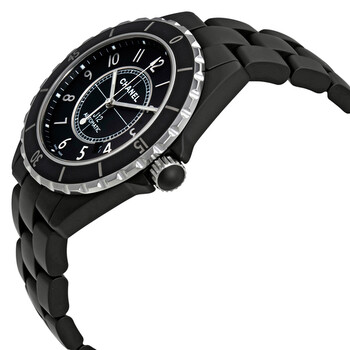 Black ceramic case with a black ceramic bracelet. Uni-directional rotating stainless steel bezel with a black ceramic top ring. Black dial with silver-tone hands and Arabic numeral hour markers. Minute markers around the outer rim. Dial Type: Analog. Luminescent hands and markers. Date display appears between the 4 and 5 o'clock positions. Automatic movement with a 42-hour power reserve. Scratch resistant sapphire crystal. Screw down crown. Solid case back. Case diameter: 42 mm. Round case shape. Deployment clasp with push button. Water resistant at 200 meters / 660 feet. Functions: date, hour, minute, second. Luxury watch style. Watch label: Swiss Made. Chanel J12 Matte Black Automatic Ceramic Unisex Watch H3131.