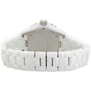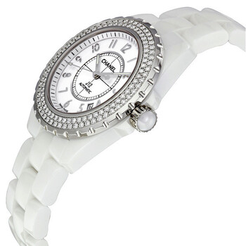 White ceramic case with a white ceramic bracelet. Fixed steel rimmed bezel set with two rows of Wesselton diamonds. White dial with luminous hands and Arabic numeral hour markers. Minute markers around the inner ring. Dial Type: Analog. Luminescent hands and hour markers. Automatic date between 4 and 5 o'clock positions. Automatic movement. Scratch resistant sapphire crystal. Screw down crown. Solid case back. Case diameter: 38 mm. Case thickness: 10 mm. Round case shape. Band length: 7 inches. Double locking deployment clasp. Water resistant at 200 meters / 660 feet. Functions: hours, minutes, seconds, date. Sport watch style. Watch label: Swiss Made. Chanel J12 Men's Watch H0969.